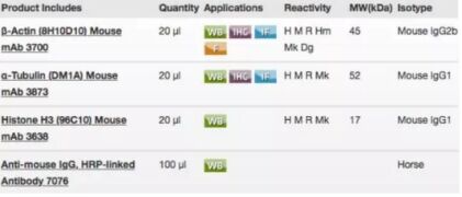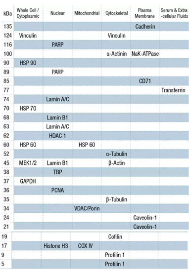 內(nèi)參蛋白主要是一些持家基因,這些持家基因執(zhí)行大量的基本功能,并持續(xù)在多種組織和細胞中高水平表達。 常見內(nèi)參蛋白包括Actin、Tubulin、GAPDH、Histone H3等。但是,研究不同類型的蛋白,對內(nèi)參的選擇是有講究的,如1)胞漿蛋白的內(nèi)參與胞核蛋白的內(nèi)參是不一樣的;2)在一定的實驗條件下,內(nèi)參蛋白的表達發(fā)生明顯的變化時需要選擇其他表達不變或者變化很小的蛋白;3)當研究的蛋白的分子量與內(nèi)參接近時,需要選擇分子量與目的蛋白的分子量差距比較大的蛋白等。