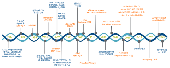 美國IDT公司,總部位于美國愛荷華州科勒爾維爾,成立于 1987年,是基因組學(xué)領(lǐng)域開發(fā)的領(lǐng)先者,也是公認的定制核酸生產(chǎn)行業(yè)的領(lǐng)導(dǎo)者。下圖是IDT從成立至今的重大事件圖鑒(藍色是資本并購,橙色是技術(shù)產(chǎn)品革新)。