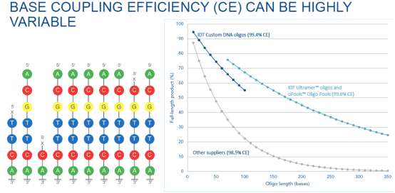 IDT的合成Oligo憑借其高質(zhì)量標準受到全世界科研者的青睞。IDT 采用合成柱法的方式單獨合成每條Oligo,在每個堿基耦合的過程中涉及到一個“偶聯(lián)效率”的概念,造就了超高的合成精度。同時IDT合成的高質(zhì)量不是說出來的,嚴謹?shù)馁|(zhì)控更是將產(chǎn)品質(zhì)量拿捏的死死的,每條Oligo通過ESI-MS(電噴霧質(zhì)譜)質(zhì)譜的方式,讓錯誤的Oligo無所遁形,并且每一個通過質(zhì)檢的oligo都有一個質(zhì)控報告,也為后期IVD客戶做申報工作提供了極大的便利。