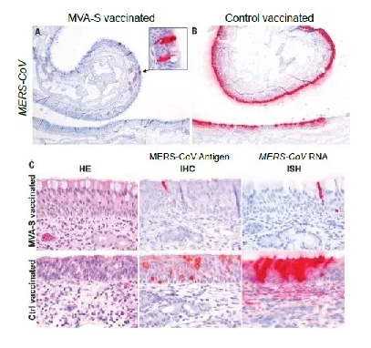 中東呼吸綜合征冠狀病毒(MERS-CoV)是又一種近年來高致病性的冠狀病毒。在對該病毒疫苗的研發(fā)過程中,Haaqmans BL 研究團隊通過 RNAscope 技術(shù)檢測了注射疫苗的效果,發(fā)現(xiàn)駱駝鼻粘膜內(nèi),病毒顆粒在疫苗注射組相較于對照組有顯著下調(diào)(見下圖,RNAscope 陽性信號為 A 圖,B 圖和 C 圖中 ISH 中的紅色信號點)[3]。