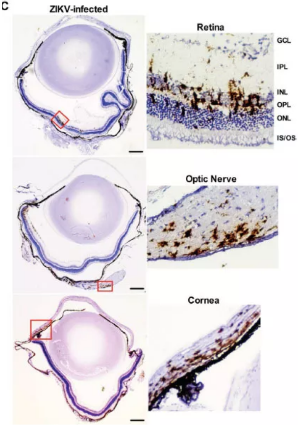 在病毒定位研究中,2015 年巴西寨卡病毒(Zika)爆發(fā)時,華盛頓醫(yī)科大學(xué) Jonathan J. Miner 為首的研究團隊即通過 RNAscope 方法檢測到寨卡病毒在視網(wǎng)膜,視神經(jīng)和角膜中的分布,直觀給出了該病毒在眼內(nèi)的分布圖(見下圖,病毒陽性信號為圖中的棕色信號點)[1]。