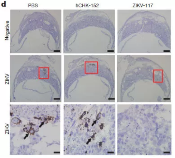 在對寨卡(Zika)病毒疫苗的研究中,美國 Vanderbilt University 的 Gopal 研究團隊發(fā)現(xiàn)人的單克隆抗體 ZIKV-117 可以有效減低小鼠感染 Zika 后組織的病理特點,并通過 RNAscope 檢測試劑盒檢測了注射安慰劑,同型對照小鼠抗體以及 ZIKV-117 抗體的懷孕小鼠胎盤內(nèi)病毒的分布和數(shù)量,從而證實了疫苗的效果(見下圖,病毒為圖中的棕色信號點)[2]。