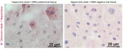 在病毒感染動物模型的建立和驗證中,Drexler JF 團隊通過 RNAscope 的方法,檢測小鼠肝細胞內(nèi) HCV 病毒的存在和分布狀況,確認 HCV 病毒感染動物模型建立成功(下圖中的紅色信號點)[4]。