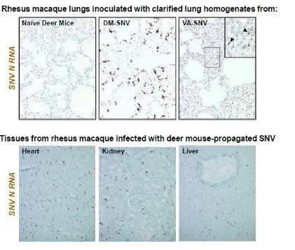 相同的 RNAscope 應(yīng)用實例也被報道在漢他病毒(Sin Nombre/Hantavirus,SNV)感染病毒動物模型中。RNAscope 結(jié)果確認漢塔病毒存在于恒河猴肺臟上皮細胞內(nèi)(下圖中棕色信號點)[5]。