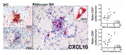 RNAscope 檢測結(jié)果顯示感染過 SVV 之后,伴隨著 CD8 陽性 T 細胞的聚集,同一區(qū)域表達 CXCL10 細胞趨化因子,提示 T 細胞的聚集是由 CXCL10 因子誘導(dǎo)引發(fā)的[4]。