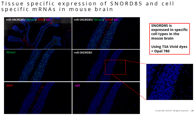 在小鼠腦組織切片的檢測(cè)中,也可獲得理想的結(jié)果。SNORD85可在小鼠腦某些細(xì)胞中特異性表達(dá),下圖中除了對(duì)SNORD85進(jìn)行檢測(cè)外,也對(duì)小鼠的神經(jīng)元(Rbfox3)、星形膠質(zhì)細(xì)胞(GFAP)、小膠質(zhì)細(xì)胞(Aif1)同時(shí)進(jìn)行檢測(cè),可見(jiàn)不同靶標(biāo)特異的定位特征。