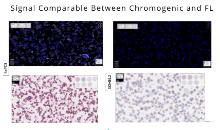 針對(duì)同一個(gè)miR-205分子,對(duì)比使用RNAscope Plus的熒光信號(hào)與使用可見(jiàn)光試劑盒miRNAscope的可見(jiàn)光紅染信號(hào),二者對(duì)于miR-205不同表達(dá)豐度的細(xì)胞中小RNA分子的檢出結(jié)果有較高的一致性,證明不同的顯色方式對(duì)于靶標(biāo)的檢測(cè)沒(méi)有影響。