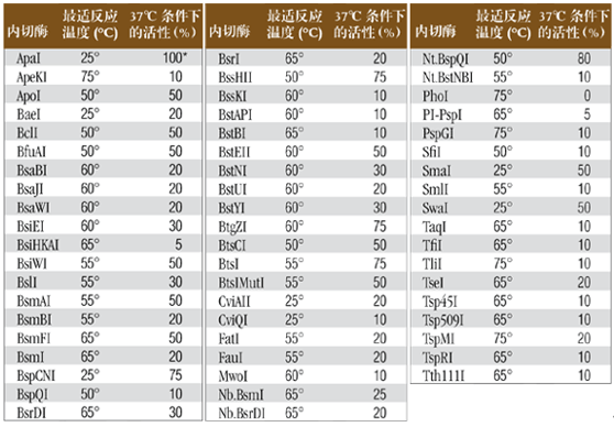 表中列出了限制性?xún)?nèi)切酶的最適反應(yīng)溫度。對(duì)于最適反應(yīng)溫度不是 37℃ 的限制性?xún)?nèi)切酶,請(qǐng)閱 2013﹒2014 商品目錄 284 頁(yè)查詢(xún)其在 37℃ 時(shí)的活性。
