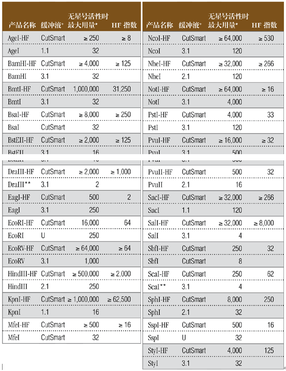 下表為 HF 內(nèi)切酶和其野生型在檢測(cè)到明顯星號(hào)活性前的最大酶用量。HF 指數(shù)代表在選擇 HF 內(nèi)切酶時(shí)酶用量增加的倍數(shù),數(shù)據(jù)清楚顯示了 HF 內(nèi)切酶帶來(lái)的靈活性。