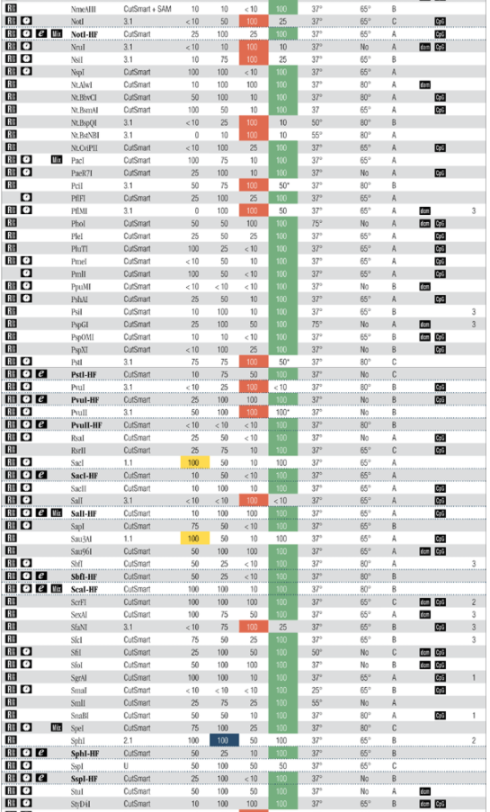 該表總結(jié)了 NEB 所有限制性?xún)?nèi)切酶的活性信息。為了幫助您選擇雙酶切的最佳條件,該表列出了酶的最佳活性 NEBuffer(隨酶提供)和每種內(nèi)切酶在四個(gè)標(biāo)準(zhǔn)緩沖液中的活性。需要注意的是 BSA 現(xiàn)在已經(jīng)添加到緩沖液中,不再單獨(dú)提供。雙酶切反應(yīng)體系請(qǐng)參考 2013﹒2014 商品目錄第 276 頁(yè)。此外,活性表中列出了反應(yīng)溫度、熱失活溫度、推薦稀釋液、甲基化敏感性和該酶是否有省時(shí)酶特性(即在建議的反應(yīng)條件下,5-15 分鐘可完全切割底物,過(guò)夜酶切也不會(huì)降解 DNA)。