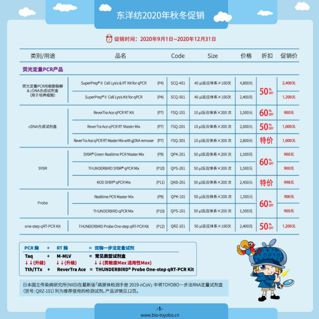 這里有KOD酶家族的最新高保真Master Mix——KOD One 系列,延伸速度可達1 sec/kb,性能卓越。更有高性能的qPCR系列產(chǎn)品,以及用于細(xì)胞逆轉(zhuǎn)錄的SuperPrep系列,可從裂解液直接合成高品質(zhì)的cDNA。