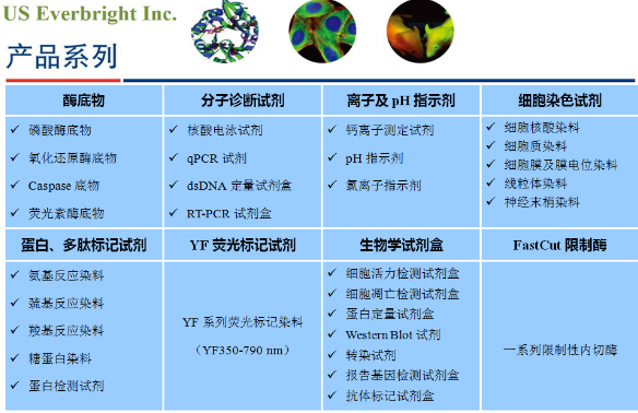 UE公司簡(jiǎn)介:US Everbright? Inc.是一家由原Life technology Inc. 和Biotium Inc.兩家國(guó)際知名生物試劑公司的研發(fā)人員在美國(guó)創(chuàng)立的技術(shù)開發(fā)導(dǎo)向型企業(yè)。US Everbright? Inc.秉持“一流世界產(chǎn)品,一流專業(yè)服務(wù)”的宗旨,致力于為生命科學(xué)領(lǐng)域科研工作者提供最卓越的產(chǎn)品和最貼心的服務(wù)。